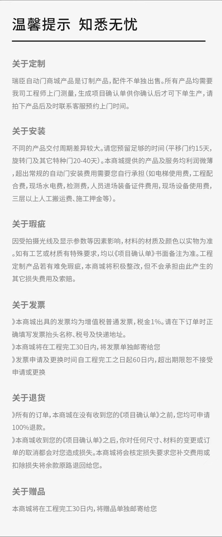 设计库+上门定制+LVSON L1Super自动门设备+安全防夹系统+铝型材结构+弧形钢化玻璃+不锈钢包饰材料+安装制作+2年上门售后服务
