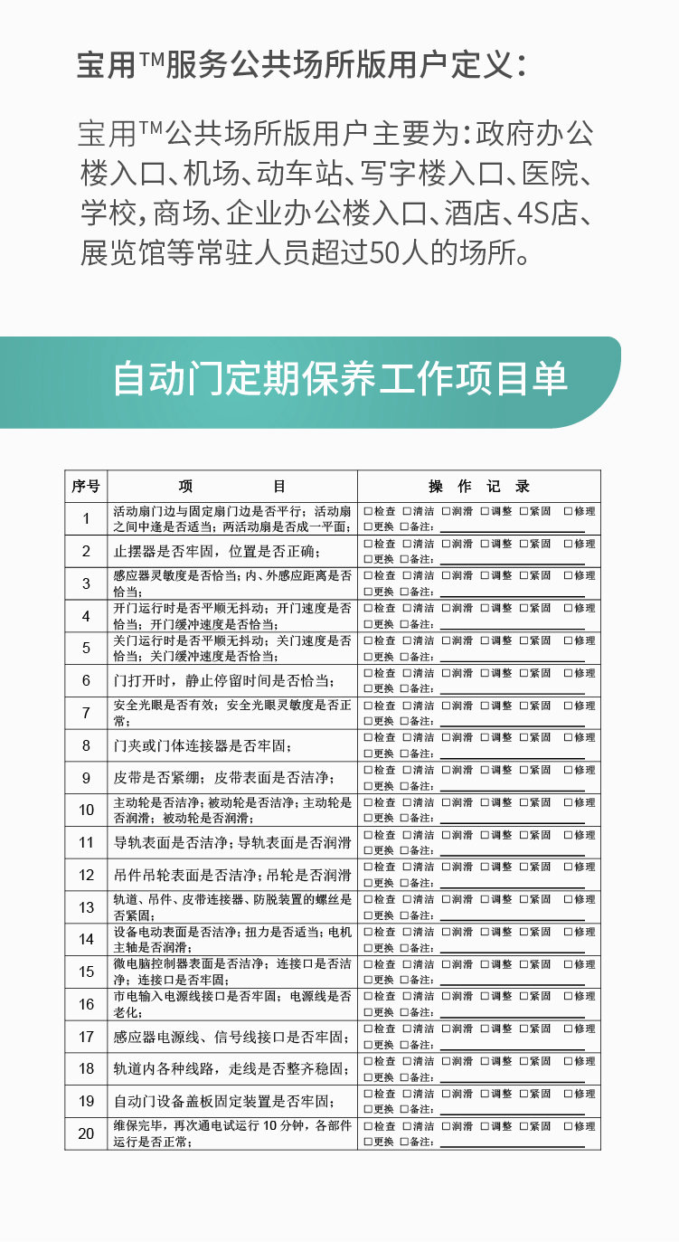 全面的自动门维保计划,免上门费、免维修费,免配件费、免保养费(1年限上海地区)