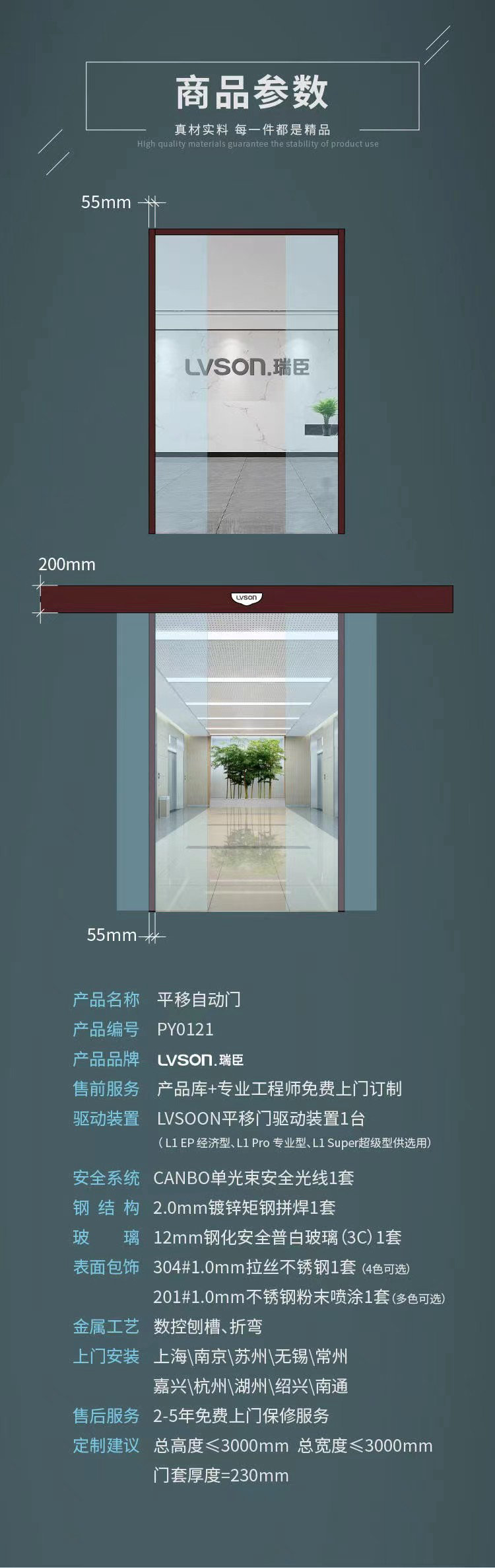 设计库+上门定制+LVSON L1自动门设备+安全防夹系统+钢结构+钢化玻璃+不锈钢包饰材料+安装制作+1-3年上门售后服务